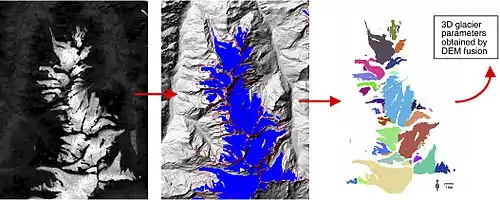 In the set of images at the center top of this section, glacier mapping steps are shown from left to right with the Landsat 7 enhanced Thematic Mapper (TM) and a geographic information system (GIS).[4]