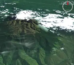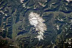 "The volcano’s summit and upper flanks are covered by several glaciers that appear as a white mass surrounding the 1-kilometer- (0.6-mile-) wide Arenas Crater; meltwater from these glaciers has incised the gray to tan ash and pyroclastic flow deposits mantling the lower slopes. A well-defined lava flow is visible at image lower right. This astronaut photograph was taken at approximately 7:45 a.m. local time, when the Sun was still fairly low above the horizon, leading to shadowing to the west of topographic high points."[35]