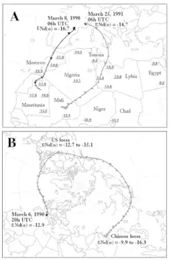 - 1 2 Francis E. Grousset; Paul Ginoux; Aloys Bory; Pierre E. Biscaye (March 2003). "Case study of a Chinese dust plume reaching the French Alps". Geophysical Research Letters 30 (6): 1277. doi:10.1029/2002GL016833. http://onlinelibrary.wiley.com/doi/10.1029/2002GL016833/full. Retrieved 2014-09-28.