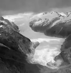 Def. a "large ice lobe spread out over surrounding terrain, associated with the terminus of a large mountain valley glacier"[3] is called a piedmont glacier.