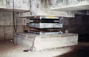 The metallic bearing support shown on the right may be adapted, with certain precautions, as a seismic isolator to skyscrapers and buildings on soft ground. Recently, it has been employed for a housing complex (17 stories) in Tokyo, Japan.