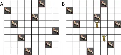 | Figure 2 Both nurseries have valid arrangements of baby lizards such that they cannot eat one another. (A) with no trees, no lizard is in a position to eat another lizard. (B) Two trees are introduced such that the lizard in the last column cannot eat the lizard in the second or fourth column. |