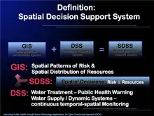 A spatial decision support system (SDSS) is an interactive, computer-based system designed to assist in decision making while solving a semi-structured spatial problem.[1] It is designed to assist the spatial planner with guidance in making land use decisions. A system which models decisions could be used to help identify the most effective decision path. An SDSS is sometimes referred to as a policy support system, and comprises a decision support system (DSS) and a geographic information system (GIS). This entails use of a database management system (DBMS), which holds and handles the geographical data; a library of potential models that can be used to forecast the possible outcomes of decisions; and an interface to aid the users interaction with the computer system and to assist in analysis of outcomes.