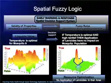 For a spatial application of fuzzy controllers continuous values between 0 and 1 are assigned to all geolocations. E.g. “temperature is optimal for mosquito X”) will take the current temperature a the geolocation as input variable and will assign a value 0.1 for the temperature in a cold area and 0.9 in a region where the temperature in