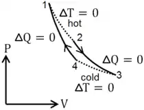 This figure shows pressure (P) as positive, but an equivalent P-V diagram could be constructed for an substance with negative pressure, such as a rubber band. The rubber band is a good example of approximate thermodynamic equilibrium because the system is never properly in chemical equilibrium - the cycles would not exactly close upon themselves as the rubber degrades into a more stable (but less desirable) substance. Nevertheless, one can construct a rubber band heat engine or heat pump: Stretch a thick rubberband and hold it stretched until it cools off to room temperature. Then decompress the rubberband and press it to your lips. It will feel cool because you have created a heat engine in reverse, called a heat pump (or a refrigeration unit).