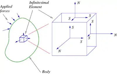 What we do is to imagine a tiny block of material inside the body and then define the stresses in that tiny block. Such a block is more commonly known as an infinitesimal element of the body.