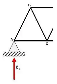 Secondly, we may begin to solve for the internal forces within each member by summing the forces around point A at the location of .