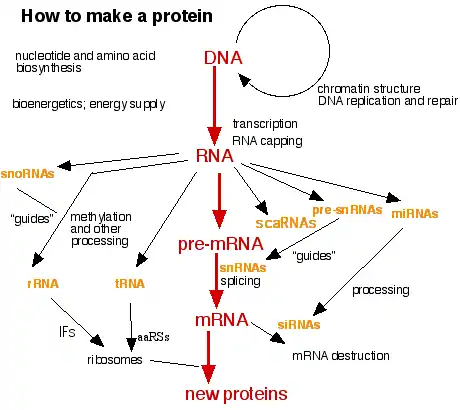 Figure 1 (above) is intended to illustrate the complexity of eukaryotic protein synthesis. Modern protein biosynthesis requires pre-existing proteins that replicate and repair DNA, regulate the transcription of genes and the production and processing of RNA molecules. Proteins are used to coordinate the synthesis and availability of nucleotide and amino acid building blocks of DNA, RNA and protein as well as all the energy required for their assembly. The modern ribosome contains dozens of proteins in addition to the ribosomal RNA molecules. As shown in figure 1, in addition to messenger RNA and ribosomal RNA, protein synthesis involves the participation of transfer RNA molecules as the carriers of amino acids that embody the genetic code. Additional proteins, aminoacyl tRNA synthetases, are used to couple the amino acids to the transfer RNAs. Additional proteins and types of RNA molecules are required for the production of functional ribosomal RNA from ribosomal RNA gene transcripts, the splicing of intron-containing transcripts, maturation of the ribozymes that catalyze splicing and there are other RNAs that regulate the degradation of messenger RNAs. In addition, all existing life forms on Earth have lipid bilayer membranes and many proteins that function as integral components of those membranes. nuclear pore proteins control the movements of RNA and proteins into and out of the cell nucleus as well as the generation of most cellular energy and the transport of food and waste molecules across the cell surface membrane. The apparent complexity of cells and the biosynthesis of proteins can be greatly simplified by making a single assumption: that there was once a "RNA World" in which proteins were much less important than in existing organisms. This assumption is consistent with the fact that ribozymes exist and the many different types of RNA molecules that are still retained as elements of the protein biosynthetic system (orange colored components in Figure 1).