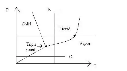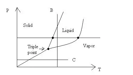 Similarly, if a substance is compressed at constant T (line B), condensation and freezing T are the T at which line B crosses the vaporization and fusion curves.