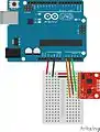It has been retired by sparkfun meaning that it can no longer be purchased. But it exists in Fritzing so it is easy to draw a circuit with it. Connecting to the Arduino Leveraged this example. A breadboard was necessary because the pins don't match the arduino headers. The alternative was to solder. Ths is how it was connected. At first only the accelerometer was connected, then the gyro was added.