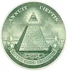The eye above the pyramid is popular among conspiracy theorists, and alleged to have connections with the Illuminati secret society. The history of the dollar bill was featured on The History Channel's "Decoding The Past" program.