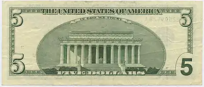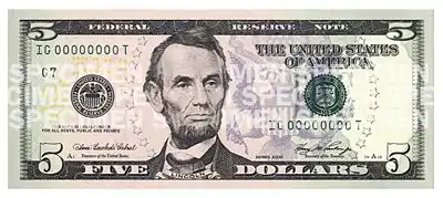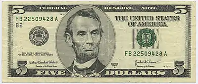 The United States $5 bill is a denomination of U.S. currency. The bill currently features U.S. President Abraham Lincoln's portrait on the front and the Lincoln Memorial on the back. All $5 bills issued today are Federal Reserve Notes.