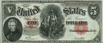 - 1869: A new $5 United States Note was issued with a small portrait of Andrew Jackson on the left and a vignette of a pioneer family in the middle.