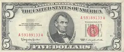Series 1963 $5 United States Note. Urban legend erroneously holds that the red seal from that year onward was done in mourning of the Kennedy assassination - 1967: Production of the $5 United States Note ends.