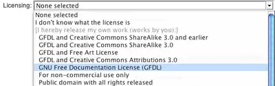 When you upload files there are multiple licensing options available, so the process for adding files can be more complex than the process for adding text. However, if the file(s) you upload contains content created by you, then you can just indicate that fact and select the GFDL as the license for your file(s). If this is the case, you can go directly to the upload page and use the licensing drop-down menu to select the menu item for "my own work" and "GNU Free Documentation License".