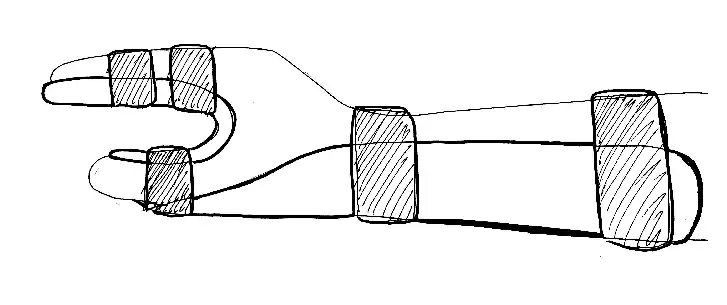 The functional aim of the device is to address the weakness of the fingers and prevent potential contractures. The design also captures the trim lines of the definitive device: