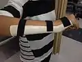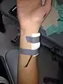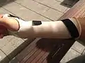 6) Now to create a pressure release point in the cast, cut out a small rectangle slightly longer then the length of the cut/scar of the patient form the surgery, now stick this foam over the wound (do not have direct contact to wound but have a type of covering to avoid this) attaching it with tape Fig 4, Now cover the arm in a stocking tying the distal end, having a hole for the thumb and hinging the proximal end to the clients shoulder or clothes to make the stocking taught. Refer to Fig 6.