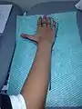 1) To create the pattern the use of a kitchen ‘Chux’ is ideal, have the patient seated and place their forearm and hand resting on the chux as shown in Fig 1, ensure fingers are close together. Draw an outline of the client hand.