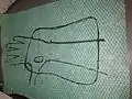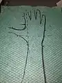 3) With a texta, now draw a pattern that is an inch wider medially and laterally then the forearm and cuts across at the distal palmar crease. It should cut through the thumbs metacarpophalangeal joint. Refer to Fig 3