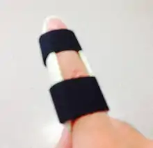 - • LTT finger splint covering palmer side of affected finger ending at MCP joint