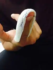 - This is a splint made to correct the deformity of swan neck deformity characterized by hyperextension of PIP and flexion of DIP. The aim of the device is to correct this deformity by preventing the hyperextension and the flexion. The device made seen on (Fig 12) was fit and the aim of the device was reached. The trim lines were not neat and the drawing lines were obvious. Although acetone was used to clear them, trim lines that were drawn earlier in the process of making the device are still appearing on the device (Fig 13). The ROM was achieved at the MCP joint (Fig 14), which was one of the goals when making the splint, thus allowing the fingers to function as normal as possible during daily activities as seen on the figures (15 & 16). Concerning the straps, straps were slightly wide than needed in relation to the small size of the splint applying more force to achieve the required goals. Also, a softer material on the lateral side of the finger could have been used on the straps to prevent the discomfort a patient may feel from the straps between is fingers. Recent studies suggest that more beneficial splints used in such cases are the custom made articulated 8 oval rings splints made of silver (Elui et al, 2012). These types of splints allow more functional hands during daily activities while preventing the hyperextension of the PIP and flexion of DIP joints. This is by allowing flexion of the PIP and DIP joints during the activities and minimizing functional difficulties. For example, when a patient is holding a water bottle as seen on figure 15, a flexion of the PIP and DIP joints will be more functional for a better grip, this can only be achieved by using the recent articulated ring orthoses. Preventing the hyperextension of the PIP and flexion of DIP are still maintained, as they are the main goals of the splint. However, due to the lack of materials a regular splint preventing hyperextension of PIP and flexion of DIP was made using LTT material.