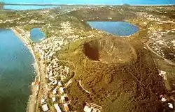 The image on the right from space of Campi Flegrei shows multiple volcanic cones and crater lakes from the past volcanism.