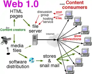 During the 1990s, the World Wide Web provided a way for people to use a network of computers to efficiently exchange files. In general, content for the Web was created by a relatively small group of individuals or small "content development groups." Once created, the content (HTML pages and media files) was uploaded to servers and then downloaded by "content consumers" who used a web browser to display webpages. The average person was not involved with creation of Web content. This period of time is now referred to as Web 1.0.