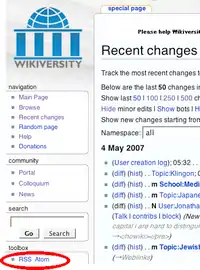 The Recent changes page has links to RSS and Atom web feeds available in the toolbox (see Figure 1). This MediaWiki feature is also available for the New pages page. These web feeds provide a way to be notified of all edits and all newly created pages at Wikiversity.