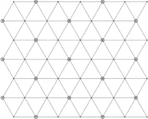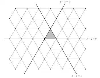 These reflecting planes divide the space V into congruent simplicies, called alcoves.[4] The situation when is shown at right; in this case, the root lattice is a triangular lattice, and the reflecting lines divide the plane into equilateral triangular alcoves. (For larger n, the alcoves are not regular simplices.)