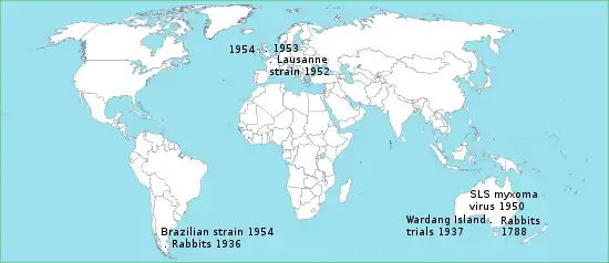 European rabbits were brought to Australia in 1788 by early English settlers (see Rabbits in Australia). Initially used as a food source, they later became feral and their numbers soared. In November 1937, the Australian Council for Scientific and Industrial Research used Wardang Island to conduct its first field trials of myxomatosis, which established the methodology for the successful release of the myxoma virus throughout the country.[20] In 1950, the SLS strain of myxoma virus from the South American tapeti (Sylvilagus brasiliensis) was released in Australia as a biological control agent against feral rabbits. The virus was at first highly lethal, with an estimated case fatality rate of close to 99.8%. Within a few years, however, this strain was replaced by less virulent ones, which permitted longer survival of infected rabbits and enhanced disease transmission. The virus created strong selection pressure for the evolution of rabbits resistant to myxomatosis. As rabbits became more resistant the viral strains responded by becoming more virulent.[2]