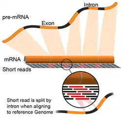 - Genome guided: This approach relies on the same methods used for DNA alignment, with the additional complexity of aligning reads that cover non-continuous portions of the reference genome.[58] These non-continuous reads are the result of sequencing spliced transcripts (Figure 5). Typically, alignment algorithms have two steps: 1) align short portions of the read (i.e., seed the genome), and 2) use dynamic programming to find an optimal alignment, sometimes in combination with known annotations. Software tools that use genome-guided alignment include Bowtie,[59] TopHat (which builds on BowTie results to align splice junctions),[60][61] Subread,[62] STAR,[58] HISAT2,[63] Sailfish,[64] Kallisto,[65] and GMAP.[66] The quality of a genome guided assembly can be measured with both 1) de novo assembly metrics (e.g., N50) and 2) comparisons to known transcript, splice junction, genome, and protein sequences using precision, recall, or their combination (e.g., F1 score).[57] In addition, in silico assessment could be performed using simulated reads.[67][68]