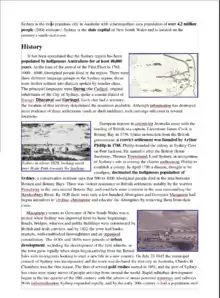 Required images: ![]() Right-click and save image to your folder ![]() Right-click and save image to your folder ![]() Right-click and save image to your folder Document text to copy and paste: Sydney is the most populous city in Australia with a metropolitan area population of over 4.2 million people (2006 estimate). Sydney is the state capital of New South Wales and is located on the country's south-east coast. History It has been speculated that the Sydney region has been populated by indigenous Australians for at least 40,000 years. At the time of the arrival of the First Fleet in 1788, 4000 - 8000 Aboriginal people lived in the region. There were three different language groups in the Sydney region; these were further refined into dialects spoken by smaller clans. The principal languages were Darug (the Cadigal, original inhabitants of the City of Sydney, spoke a coastal dialect of Darug), Dharawal and Guringai. Each clan had a territory; the location of that territory determined the resources available. Although urbanisation has destroyed most evidence of these settlements (such as shell middens), rock carvings still exist in several locations. European interest in colonising Australia arose with the landing of British sea captain, Lieutenant James Cook in Botany Bay in 1770. [The rest of this paragraph is missing - you need to type it in!] Macquarie's tenure as Governor of New South Wales was a period when Sydney was improved from its basic beginnings. Roads, bridges, wharves and public buildings were constructed by British and Irish convicts, and by 1822 the town had banks, markets, well-established thoroughfares and an organised constabulary. The 1830s and 1840s were periods of urban development, including the development of the first suburbs, as the town grew rapidly when ships began arriving from the British Isles with immigrants looking to start a new life in a new country. On July 20 1842 the municipal council of Sydney was incorporated and the town was declared the first city in Australia, Charles H. Chambers was the first mayor. The first of several gold rushes started in 1851, and the port of Sydney has since seen many waves of people arriving from around the world. Rapid suburban development began in the last quarter of the 19th century with the advent of steam powered tramways and railways. With industrialisation Sydney expanded rapidly, and by the early 20th century it had a population well in excess of one million. The Great Depression hit Sydney badly. One of the highlights of the Depression era, however, was the completion of the Sydney Harbour Bridge in 1932. |