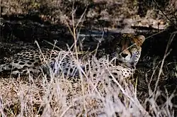 Cheetahs (Acinonyx jubatus) are the fastest hunters in Africa, but you are quite lucky if you can see them very close because they tend to be hidden in the high grass. You don't see them in the dense thickets of South Africa whereas the savanna in Kenya and Tanzania allows for better viewing. Cheetahs usually travel alone or in small groups consisting of the mother and her offspring. They hunt in the cool hours of the day. Cheetahs reach a maximum speed of up to 100 km/h in a short and explosive burst, and tackle their prey in a single attack. The preferred prey is Impala, but birds are on the menu as well.
