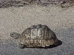 Geochelone pardalis can be best spotted on tarred roads (they are virtually invisible in the high grass from a car). They like to drink water from tarred roads.