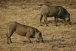 Phacochoerus aethiopicus are medium sized mammals with a mixed diet. Warthog babies are born at the beginning of the rainy season (December-January) and live for the first 6-7 weeks in their burrow and then start to follow their mothers. Note their interesting habit of bending their front legs to graze!