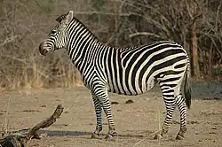 The plains zebra (Equus quagga) is common in national parks throughout eastern and southern Africa and easily recognized due to its striking white and black stripes. It is divided into seven subspecies, of which six still exist (the quagga, E. q. quagga, was hunted to extinction in the late 19th century). Burchell's zebra is one of the more common subspecies, with gray "shadow" stripes, while the rarer Crawshay's zebra (found in Zambia's South Luangwa) lack these. The mountain zebra (E. zebra), a separate endangered species, is found in the dry and hilly regions of southern Africa, notably the Mountain Zebra National Park. The third and physically largest species, Grévy's zebra (E. grevyi), found only in small parts of Kenya and Ethiopia, is even more endangered than the mountain zebra and is strongly protected in both countries.