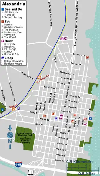 - π Carlyle House, 121 North Fairfax St, β +1 703 549-2997. Former home to a successful local merchant, the house served as the headquarters of British Maj. Gen. Braddock before his ill-fated 1755 campaign in western Pennsylvania. The house also served as the site where several colonial governors met to discuss financing of the French and Indian War, and later, the state of affairs with the British Crown, leading to subsequent meetings at Annapolis, and Philadelphia, where the Declaration of Independence was drafted. Supposedly the only house in town that's not haunted because Carlyle had a cat entombed in a wall.