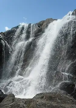 The snow-capped Kuiten Uul mountain, 4374 m (14,201 ft), is the highest of the five peaks of Tavan Bogd Mountains (literally '5 Saints') that gives the park its name. It covers an area of 630,000 ha and is home to three large freshwater lakes and 34 glaciers, plus several waterfalls. The largest, Potanin Glacier, covers 23 km2. Tavan Bogd Mountains are considered sacred to local Kazakhs, Tuvans, and Mongolians. The park stretches from Russia along the Chinese border, following the Altai Mountain Range that divides China, Russia, Mongolia, and Kazakhstan, for over 200 km. Ancient tribes have left many artifacts, using the region for religious ceremonies. Today, tens of thousands of petroglyphs in the park are part of a World Heritage Site. In addition there are numerous Turkic Stone Men and stone burial mounds.