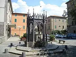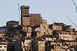 - Aldobrandeschi Castle — The construction of the castle, around which the town would develop, dates from about the year 1000. From the 12th to the 14th centuries, it was a stronghold of the Aldobrandeschi and a bulwark against invasion of the Amiata territory by Siena. The north side of the complex is characterized by a tower that rises beyond the roof of the highest building in the compound. The top of the tower is crowned by a series of blind arches resting on shelves. The fortress, which has been restored, is used as a space for cultural activities. From the top of the tower there is a splendid panorama of Mount Amiata.