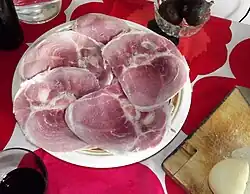 - Salamis - The most widespread are salam 'd l'ula, (i.e. preserved in fat), which are prepared using pork, salt, pepper and, sometimes, red wine: equally characteristic are salam 'd vaca (beef), salam d'asu (donkey), and those made from goat's meat. More localized examples include salam 'd patata (which includes boiled potatoes and little blood) and paletta di Coggiola, a shoulder of ham flavoured with salt and pepper, that is then packed into bladder skins and left to dry in the air. Cheeses and salamis can be found in specialist shops, and during weekly markets and village fairs.