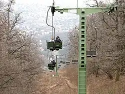 : Széll Kálmán tér further tram: 61 to stop Hűvösvölgy 5 min walk to Lower Terminal. To Upper station (Széchenyi-hegyi állomás) take Cogwheel tram (see above) to the Upper station and 200 m walk), ☏ +36 1 397 5392, fax: +36 1 397 5396, info@gyermekvasut.hu. May-Sep all day, other only Tu-Su. Using in the Buda Hills is a great escape from the city. If you feel like doing it, take the Children's Railway through the hills to Hüvösvölgy and take tram 61 back down to Széll Kálmán tér. The cogwheel tram accepts local travelcards, but the Gyermekvasút does not, and fares can be found here. Also if you have an old map, you're supposed to find Pioneers' Railway (Úttörővasút) instead of Children's Railway in it, which is the former name of the railway from the Soviet era. More info: Budapest#Get around One-way Ft700, return Ft1400, student half price. - 🌍 Zugliget Chair-lift (Libegő), XII. Zugligeti út, 97 (Lower station) (