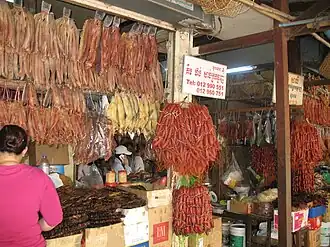 - Prawn cakes (កំពិសចៀន, kompis chean) — another popular street food snack made from a mixture of rice flour and prawns fried in oil in a pan and eaten freshly fried by dipping in a mixture of lime juice, ground black pepper and salt.