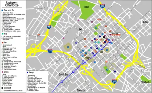 Charlotte's "biggest" attraction is its skyline. Dominated by the Bank of America tower (a Cesar Pelli masterpiece), the skyline is largely composed of striking modern towers. Tucked into the inner avenues are shorter, historic towers; however, only a few of these remain. The result is that Charlotte has a highly recognizable skyline that has been in a state of flux for about 30 years. Visitors to Tryon St. often note that the preponderance of huge towers makes it feel like a slice of Wall Street, though the illusion fades quickly only a few blocks away. When visiting Tryon St. it is worth spending some time in the Bank of America lobby, which is dominated by three expansive frescoes by North Carolinian Ben Long. Another Long frescoe is inside a dome at the Transamerica building only a short walk down the street. Another major architectural attraction is the Hearst Tower, which puts a modern spin on Art Deco. Its impressive facade and unusual profile have made it something of a cult favorite among students of architecture. It has often been said that the Hearst Building and Bank of America tower are a scaled-down version of New York City's Chrysler and Empire State Buildings. Not all of Charlotte's architectural energy is spent on Tryon St. Most of the middle-ring neighborhoods have retained their historic styles. 1920s bungalows dominate the old mill-village neighborhoods, while large 19th-century country estates are to be found in Myers Park. Though these are far more understated than the huge corporate towers Uptown, they are indicative of Charlotte's real architectural heritage. |