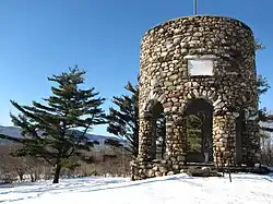 Stone tower honoring the settlers of New Providence, now Cheshire, and holding the tomb of Col. Jorab Stafford, hero at battle of Bennington during America's War of Independence