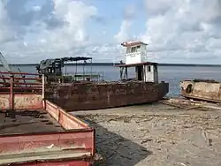 Rusting boats can be seen on the beach.