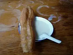- Yóutiáo (油条) – literally "oily strip", known as "deep-fried ghost" (油炸鬼) in Cantonese-speaking areas, a sort of long, fluffy, oily pastry. Youtiao with soy milk is the quintessential Taiwanese breakfast, while youtiao is a common condiment for congee in Cantonese cuisine. Legends said that the youtiao is a commoner's protest of a collaborator who framed a patriotic general to death during the Southern Song Dynasty.