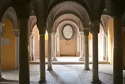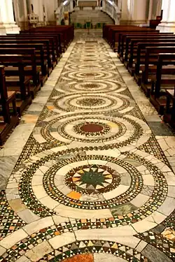 - The Cathedral of S. Maria Maggiore (Il Duomo). This is a very attractive building. There is considerable Cosmatesque work (geometrical floor mosaics) both inside and out. Uniquely, this duomo has a Cosmatesque facade (signed and dated in gold mosaic tiles, dated 1210) as well as Cosmatesque floor mosaic work. These patterns were created in the Middle Ages from thin slices cut from colored marble and columns left in the ancient ruins. The name derives from a Roman family, the Cosmati, who did this sort of work. Similar Cosmati floors can be found in Rome, Anagni and Spoleto. The high altar is fashioned from a sarcophagus of the 3rd or 4th century. The ancient crypt is fascinating and well worth visiting. Sadly the interior was redone in the 1740s but retains many of its antique marble columns. The organ is the same one on which the young Wolfgang Amadeus Mozart played. Outside, the effect of the beautiful portico, dating back to 1210, is somewhat spoiled by the modern fence that protects it. To see what the original interior would have looked like, visit the Basilica at nearby Castel Sant'Elia.