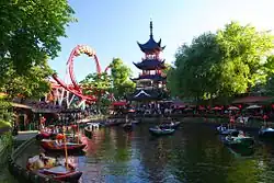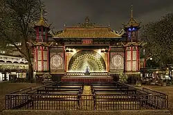 - 🌍 The Pantomime Theater (Pantomimeteatret). A beautiful Chinese-style open-air stage, where the curtain is designed as feathers of a peacock. Famous pantomime plays of HC Andersen stories, Pjerrot and Harlequin.