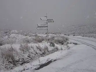 - 🌍 Wicklow Gap further south is likewise the top of a pass at 475 m (1558 ft), but loosely applies to the scenic road R756. Westbound this starts from Laragh and passes the monastic complex at Glendalough, then climbs Glendasan. There are two car parks near the crest from where you can climb Turlough Hill and Camaderry to the south, or just stroll round the little corrie lake at their foot, or climb Tonelagee to the north. The road then descends into the valley of King's River, with St Kevin's Way hiking trail parallel. Stay on R756 to reach Hollywood or turn north on R758 by the lake shore to reach Blessington.