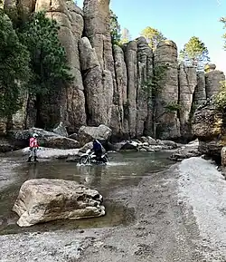 The park is found in the Sierra de Majalca mountain range a subdivision of the Sierra Madre Occidental. Mountain peaks in the park reach an elevation of 2,600 m (8,500 ft) above sea level. The park is part of the dominant Bavícora-Bustillos Transition which is characterized by many small elevated valleys surrounded by volcanic mountains. The highest peaks in the park are: Cerro Las Escobas, Cerro La Puerta, Cerro Los Almíceres, and Cerro del Agua. The park is almost completely covered by volcanic rocks that have been shaped into amazing formations by wind and water erosion.